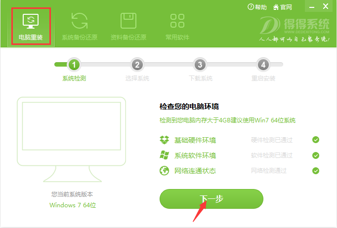 01第一步点击下载软件,并正常打开, 点击软件首界面"电脑重装"按钮,系统检测完成后点击下一步,如左图所示: