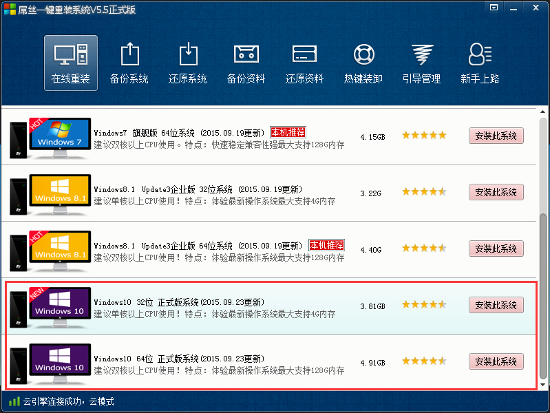 02第二步进入"系统选择",从屌丝提供的两种Win10系统中进行选择。用户根据需求选择系统;如右图所示: