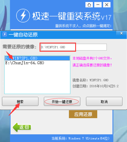 03第三步还原系统:点击应用还原,点击搜索,在搜索结果里选出镜像系统文件,然后点击“开始一键还原”,完成系统还原。如左图所示: