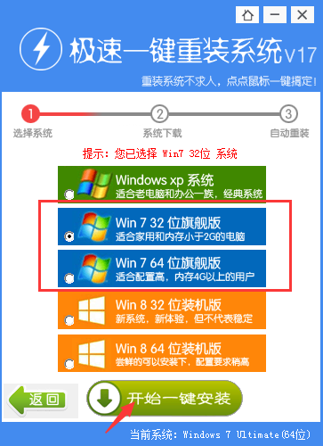 02第二步极速重装系统在这里提供了两种win7系统版本,大家可以根据个人需要选择,选择完点击"开始一键安装"即可,如右图所示