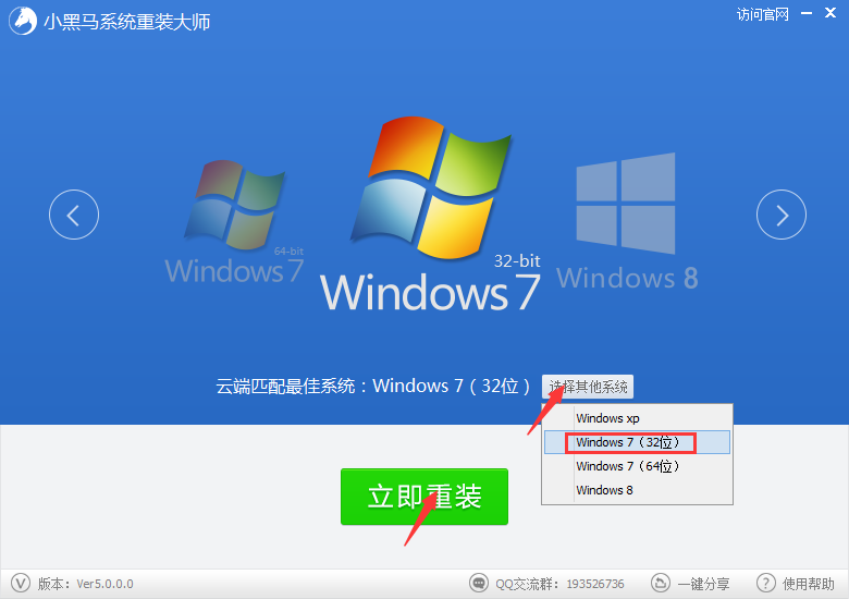 01第一步点击下载软件,并正常打开,点击软件首界面“选择其他系统”并选择win7 32位,然后点击立即重装,如左图所示: