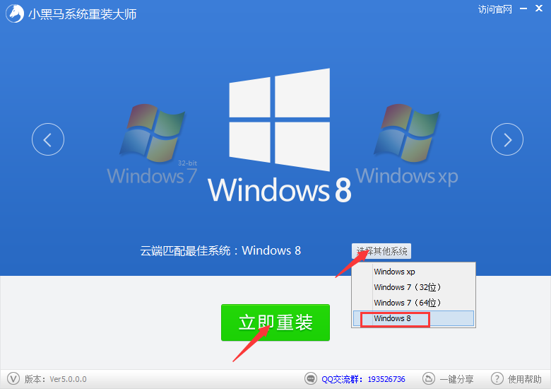 01第一步点击下载软件,并正常打开,点击软件首界面“选择其他系统”并选择win8,然后点击立即重装,如左图所示: