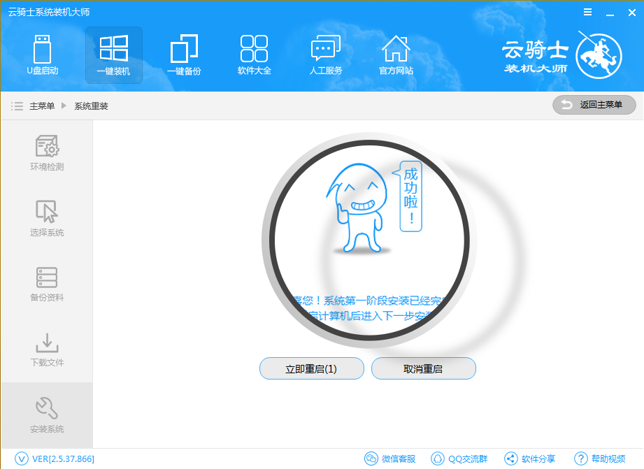 07第七步系统下载完成,云骑士会对用户进行提示重启电脑,用户只需重启即可。