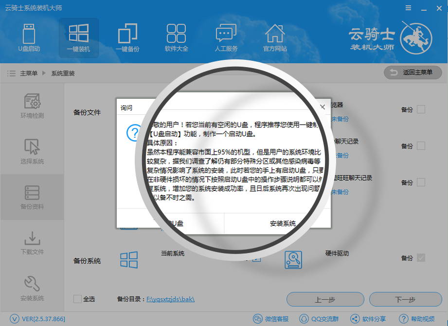 04第四步云骑士为用户提供备份文件及系统,让用户能够得到文件的恢复以及系统的恢复。(根据用户所需进行备份)。选择下一步。