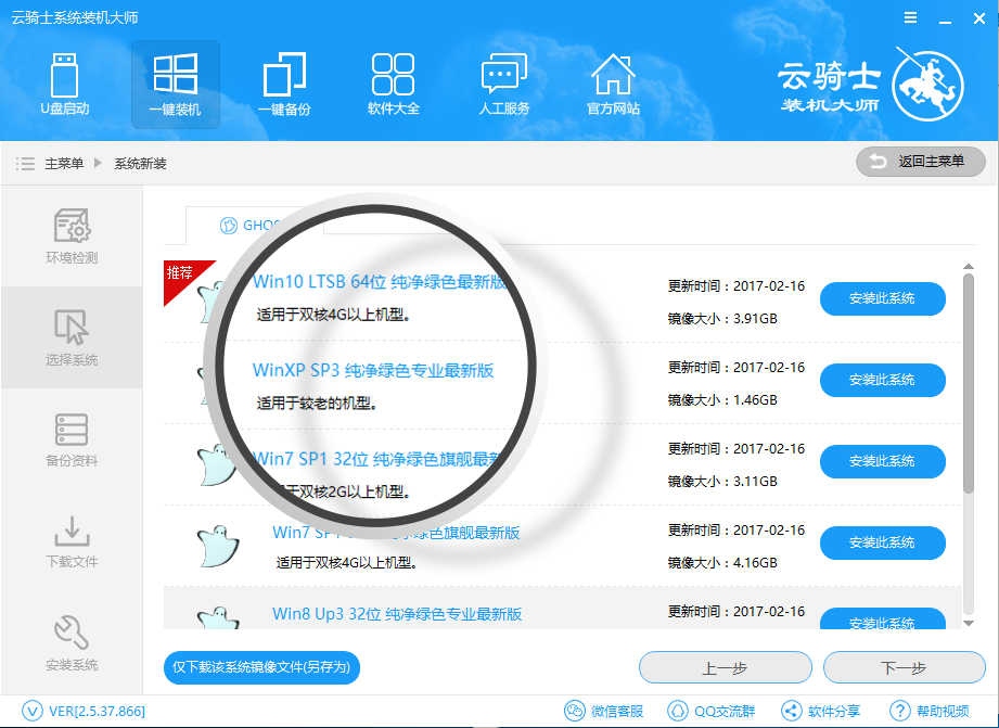 06第六步选择安装系统,云骑士将为用户自动全程安装,用户只需等待云骑士下载完系统即可。