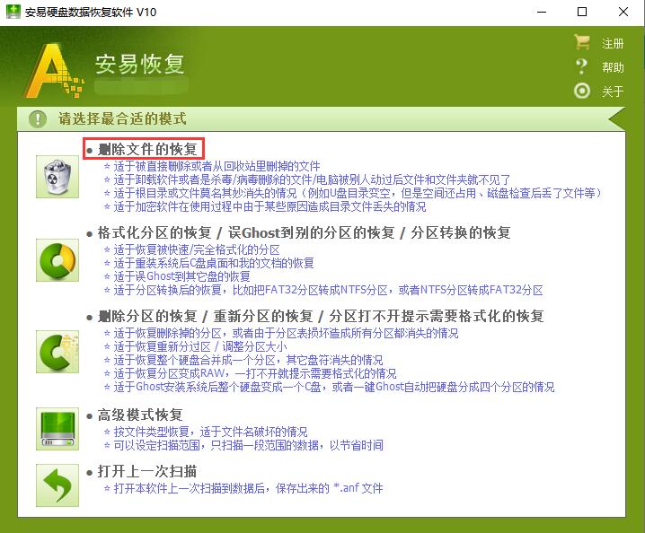 运行安易硬盘数据恢复软件,按tif文件丢失情况选择合适的模式,这里以删除文件的恢复为例。