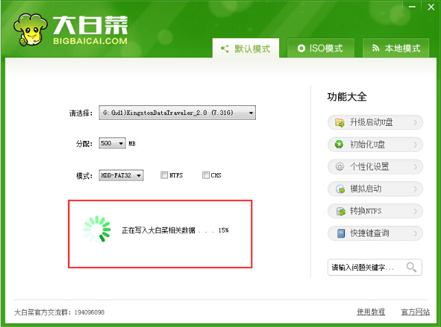 03第三步等待制作大白菜u盘启动盘的数据写入过程。