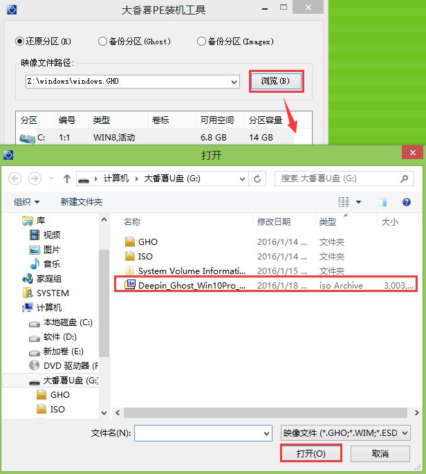 03第三步接下来点击大番薯pe装机工具的“浏览”工具,选择win10系统安装包,单击“打开”,添加进映像文件路径中