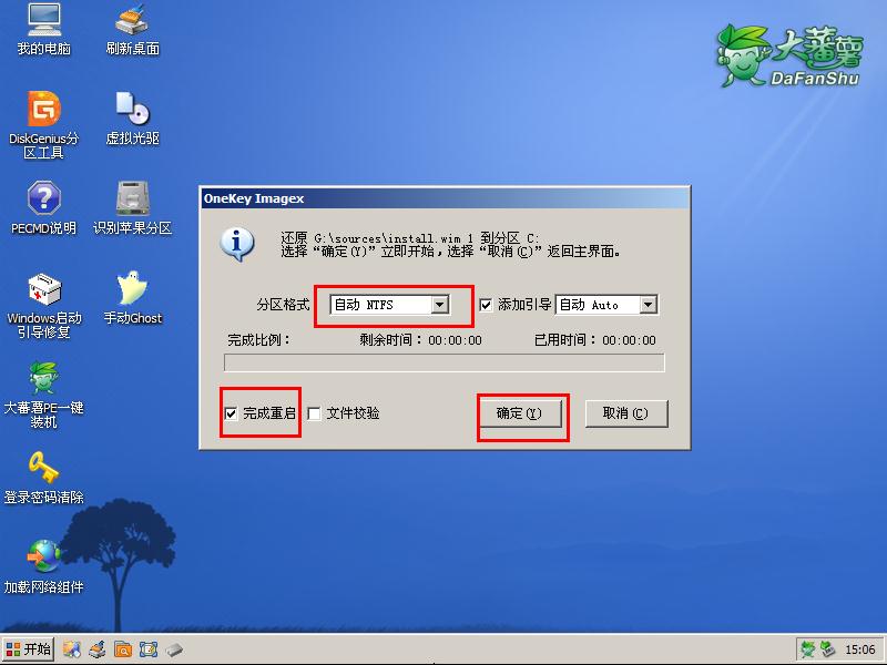 04第四步随后在出现的窗口下选择分区格式,接着勾选“完成重启”的选项,最后点击“确定”按钮即可