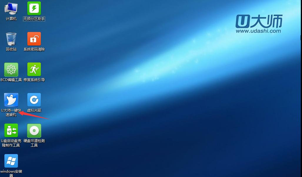 03第三步进入win8pe后桌面图标会自行跳动三次,U大师快速装机便会自动弹出,如果没有自动弹出,网友可以点击运行桌面上的“U大师一键快速安装”