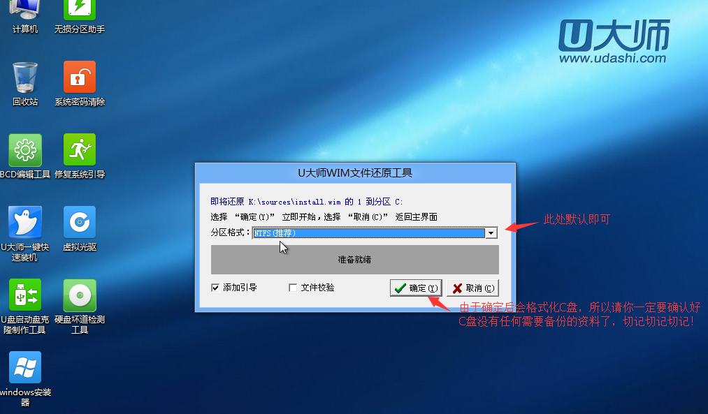 05第五步点击完开始后就会弹出图中所示界面,我们只需要选择默认就行,安装的时候是会格式化C盘的,所以广大网友一定要确认好,如有数据请及时备份,确认C盘已经没有什么重要信息了,再点击确定按钮