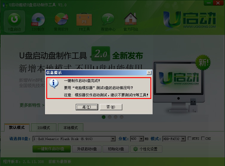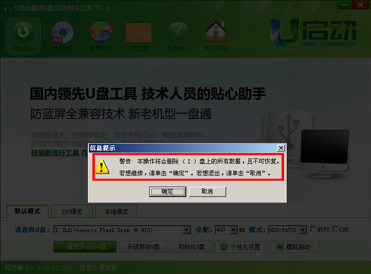 02第二步运行U启动主程序后插入需要制作启动盘的U盘,插入U盘之后点击“一键制作启动u盘”按钮,软件会自动提示是否继续,确认所选的U盘无重要数据后开始制作: