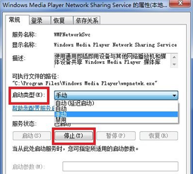 5、在打开的“Windows Media Player Network Sharing Service属性”界面中,将启动类型修改成“手动”,服务状态修改成“停止”,点击“确定”保存后退出。