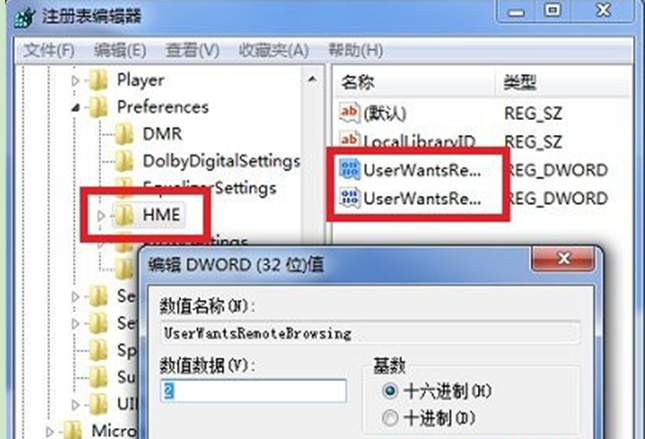 8、点击HME项,然后在右侧窗口分别双击字符串值UserWantsRemoteBrowsing及UserWantsRemoteSharing,将数值数据修改成2(十六进制),保存后退出注册表即可。
