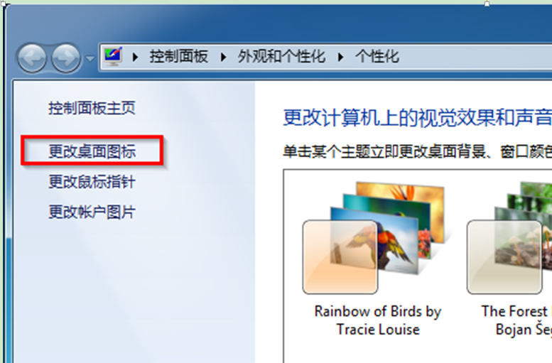 2、在“个性化”界面中,选择左侧的“更改桌面图标”