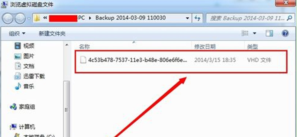 4、在打开的界面中,选择VHD文件,一般放在文件“WindowsImageBackup”里面,点击选择文件;