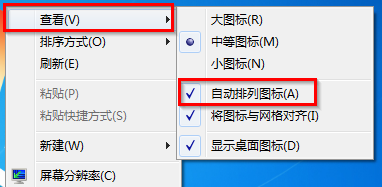 在桌面上的任意空白处右键,选择“查看(V)”——“自动排列图标(A)”命令,使桌面上的图标自动排列。