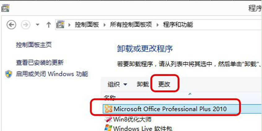 1、依次点击打开“开始——控制面板——程序和功能”,找到Office2010安装项目,点击上面的“更改”。
