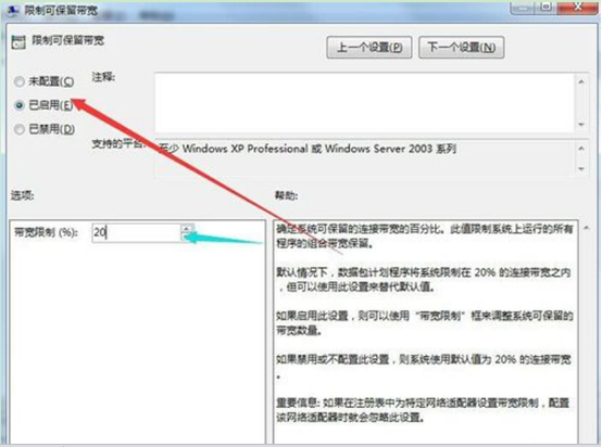 3、点击限制保留宽带,点击已启用,然后将带宽限制改为20%。点击“应用——确定”即可。