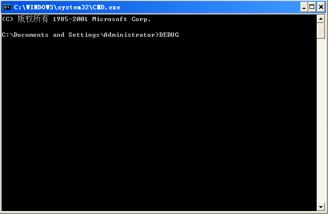 2、在打开的命令提示符窗口中,输入“DEBUG”命令,进入DEBUG编辑界面。