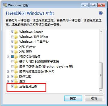 3、在打开的“windows功能”窗口,取消选中列表框中的“远程差分压缩”复选框,然后点击“确定”保存即可。