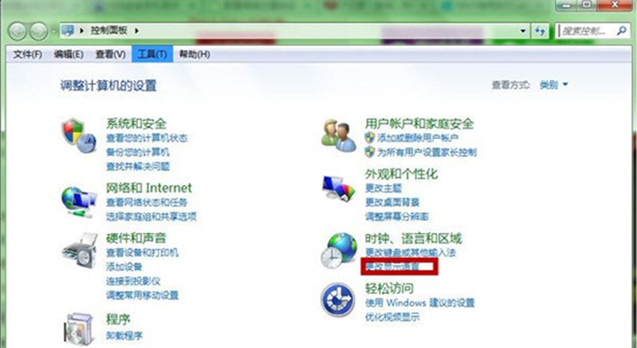 2、点击“开始——控制面板 ”,在“时钟、语言和区域”下方,选择“更改显示语言”。