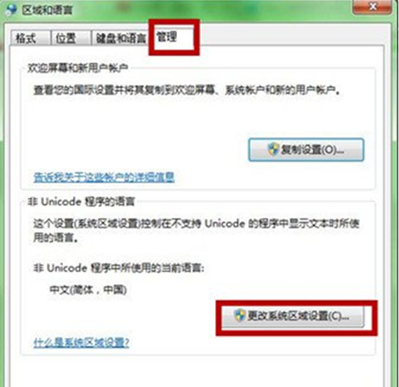 3、在弹出的“区域和语言”对话框中,切换到 “管理”标签,选中“更改系统区域设置”。