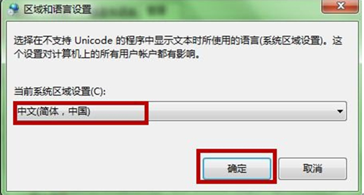 4、在弹出的“区域和语言设置”窗口中,把“非Unicode程序中所使用的当前语言”更改为“简体中文”即可,点击“确定”后,关闭窗口。如果已经是“简体中文”,可以先改为其它的语言,然后再改回“简体中文”,就可以修复中文显示乱码的问题了。