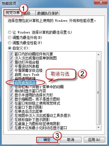 4、在当前视觉效果设置中,取消勾选“启用桌面组合”后,按“确定”退出。