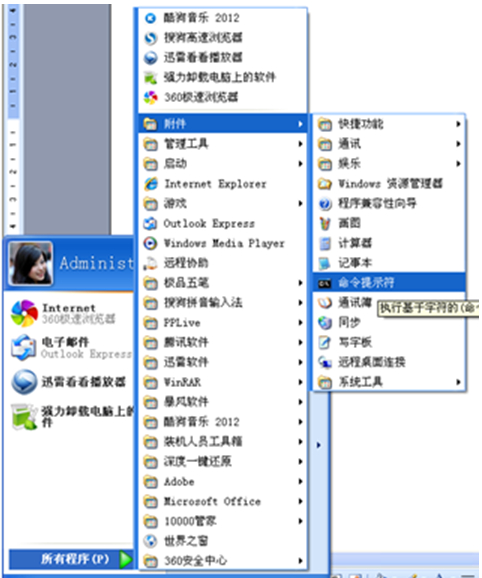 1、开附件—–命令提示符。(注意要使用右键管理员方式运行)。