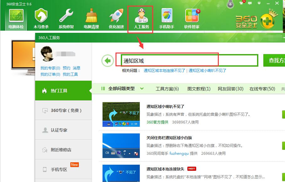 2、点击360安全卫士上方的“人工服务”,在搜索区域处输入“通知区域”进行查找