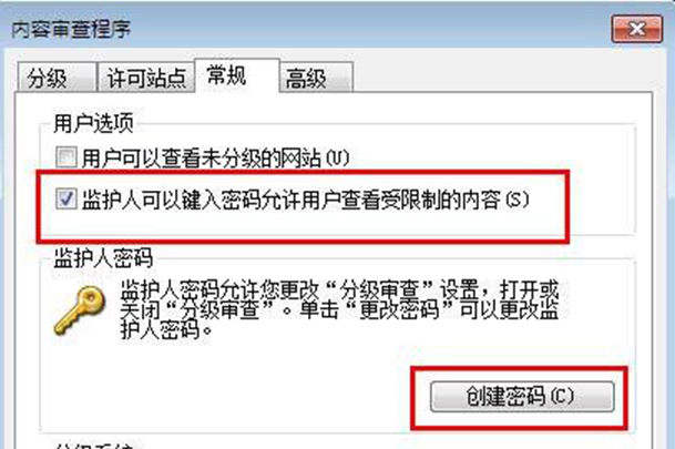 3、在弹出的窗口中,切换到“常规”标签页,勾选“监护人可以键入密码允许用户查看受限制的内容”,点击“创建密码”。