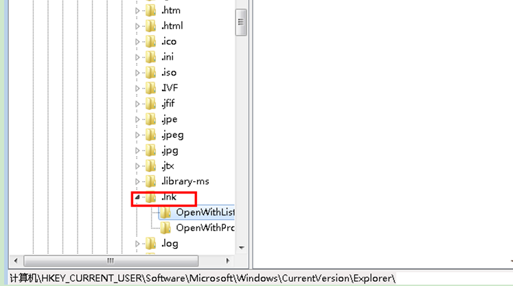 2、在打开的注册表编辑器中依次定位到以下注册表项“HKEY_CURRENT_USER//SOFTWARE//MICROSOFT//WINDOWS //currentversion//Explorer//FileExts//.lnk”。