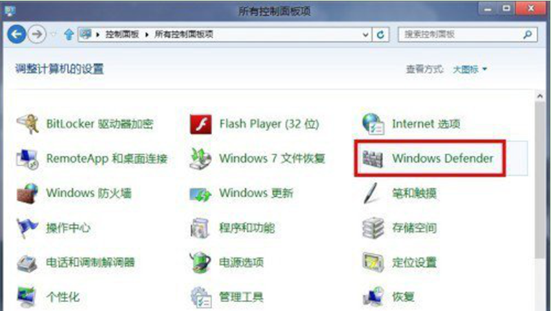 打开windows Defender的方法:点击“开始——控制面板”,查看方式为大图标,就能看到“windows Defender”。