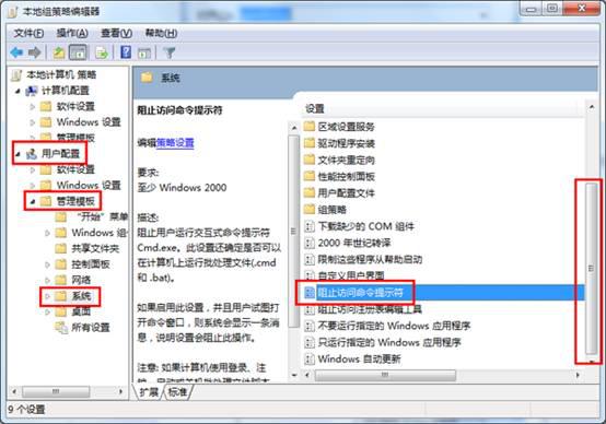 2、在打开的本地组策略编辑器,从左边栏目中依次进入“用户配置” — “管理模块” — “系统”,在右侧窗口中,下拉滚动条,双击“阻止访问命令提示符”选项。