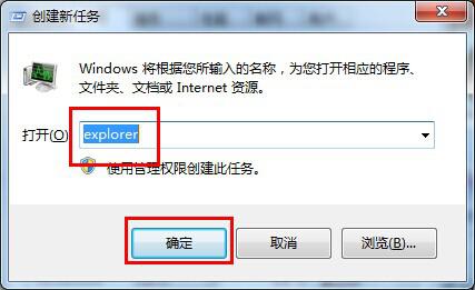 2、在打开的任务管理器中,点击“文件——新建任务”,在弹出的“新建任务”窗口中输入“explorer”命令后点击确定。