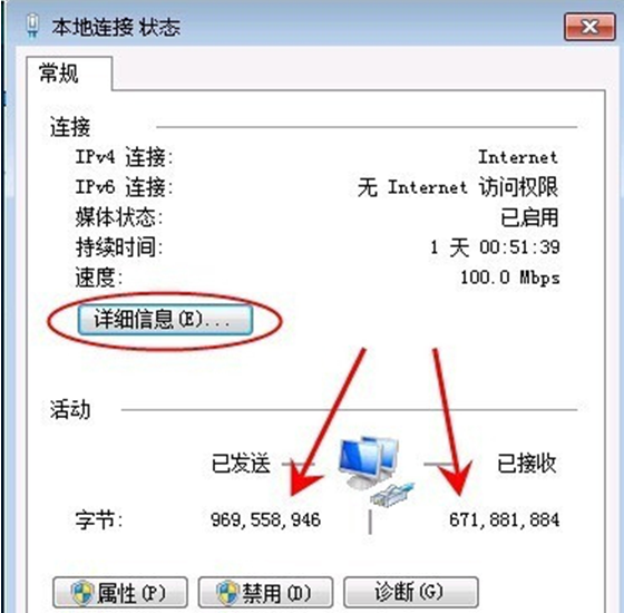 2、在打开的网络和共享中心里,直接点击箭头所示本地连接的地方进入本地连接,在这里便可详细的看到本地连接网卡的接受数据和发送数据的详细信息,我们便可在详细信息里看到网卡的IP配置情况。
