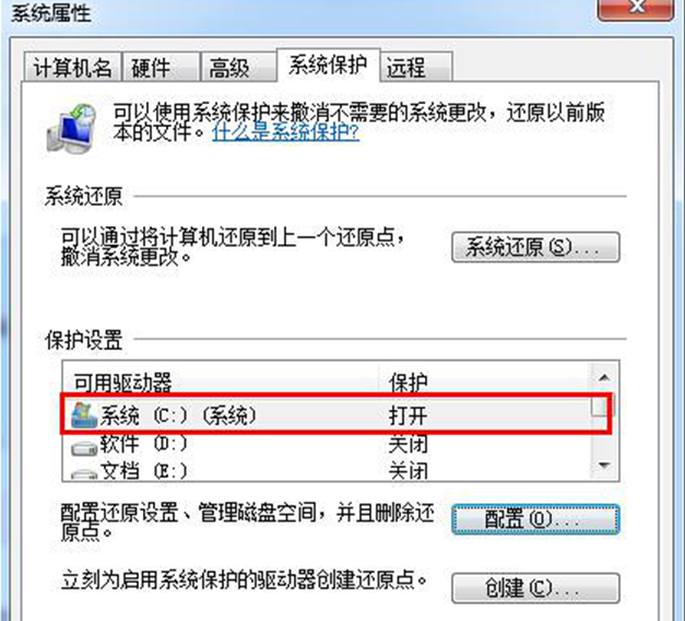 2、检查是否C盘没有开启系统保护原因,打开即可,具体操作是:在“计算机”图标上右击选择属性,点击左侧的系统保护,看看是否C盘开启了系统还原,如果没有的话,点击配置,然后在打开的配置窗口中,选择“还原系统配置和以前版本的文件”。