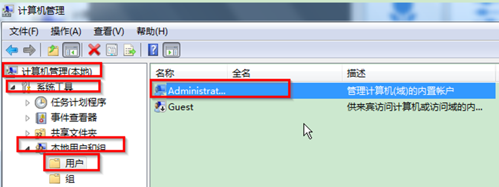 2、在打开的计算机管理界面中,点击计算机管理(本地)——系统工具——本地用户和组——用户,双击窗口右边的 “Administrator”的账户,打开“Administrator 属性”窗口。