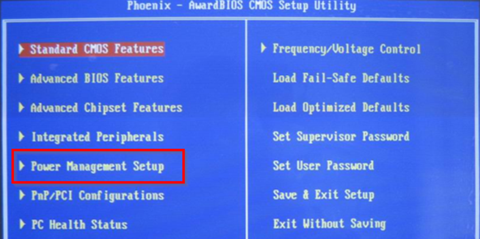 1、开机的时候按住delete键进入BIOS的设置程序,找到并选择进入“Power Management Setup”的窗口。
