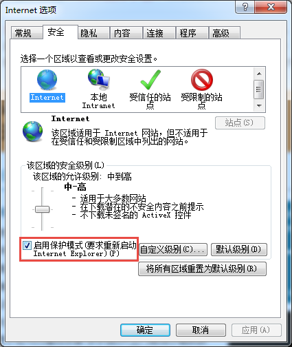 1、点击“开始——控制面板——网络和 Internet——Internet选项”在打开的“Internet选项”窗口中,在安全标签页中,勾选“启用保护模式----”。