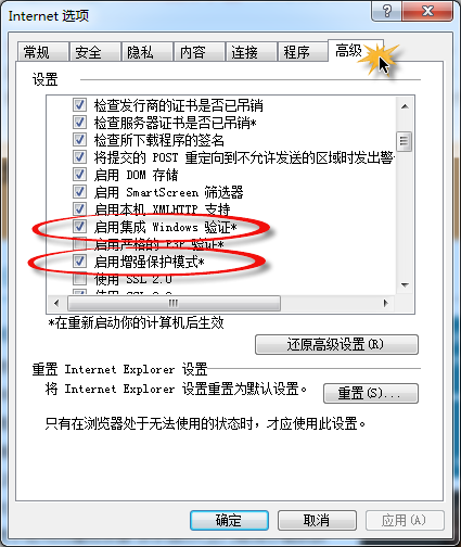 2、在“高级”标签页中,勾选“启用集成Windows验证”和“启用增强保护模式”。