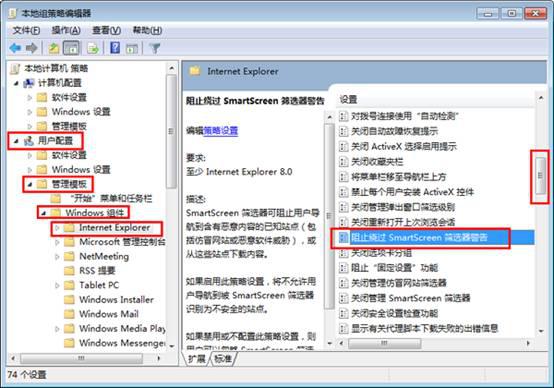 2、在打开的本地组策略编辑器中,依次进入“用户配置” — “管理模块” — “windows组件” — “internet explorer”,在右边窗口中下拉滚动条,找到并双击“阻止绕过smartscreen筛选器警告”选项。