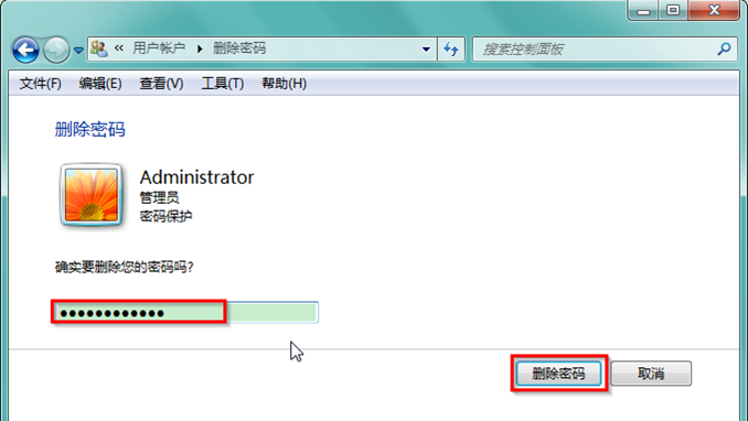 3、在删除密码窗口中,输入需要删除的当前密码,点击“删除密码”即可。