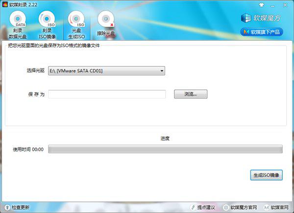 2、选择“光盘生成ISO”选项卡,然后选择插入了Win7系统光盘的光驱(一般都只有一个光驱,无需选择),再选择保存的位置。然后点击“生成ISO镜像”