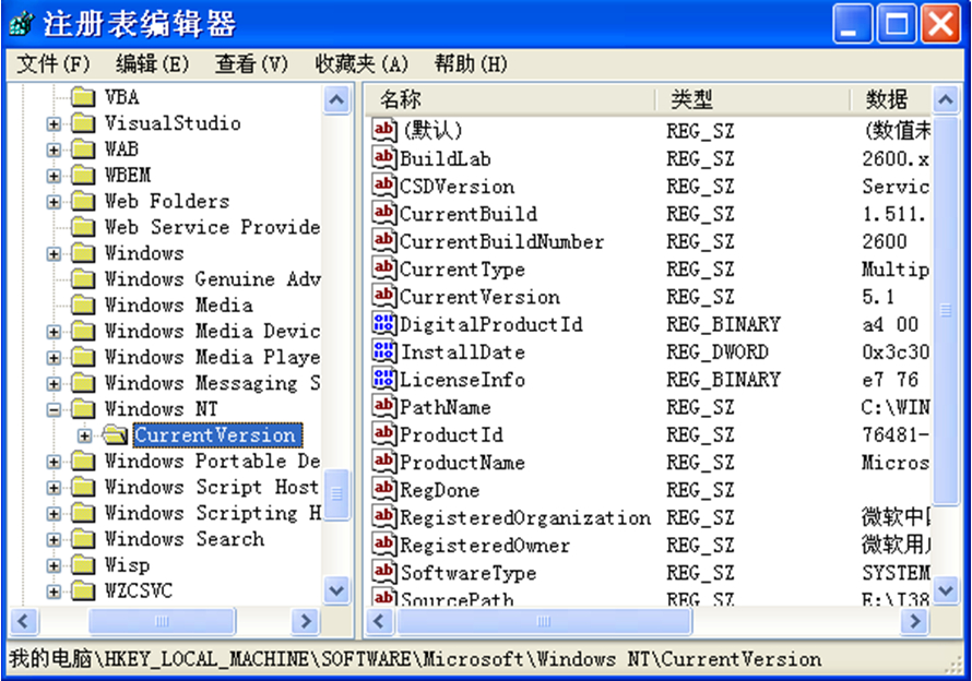 2、在打开的注册表编辑器中依次点击打开到以下注册项:HKEY_LOCAL_MACHING\SOFTWARE\Microsoft\Windows NT\CurrentVersion\