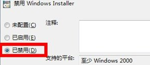 3、在右侧窗口中 第一项便是禁用windows installer,在该项双击,在弹出来的设置窗口中将配置设置为“已禁用”,然后点击下方的“确定”按钮保存,退出组策略编辑器即可。
