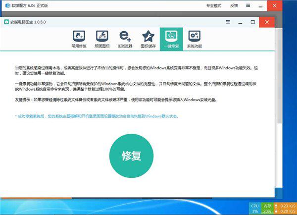 3、如果是系统错误,您可以尝试修复系统文件,包括覆盖安装,运行sfc修复程序等,此操作可借助。软媒魔方来修复,简单、有效。具体操作为: