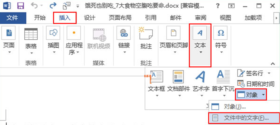 1、在系统之家Win7旗舰版系统中打开Word2013,选择打开其中一篇文档,打开了选中其它文档插入的位置,然后切换到“插入”选项卡,单击“文本”——“对象”——“文件中的文字…”选项。