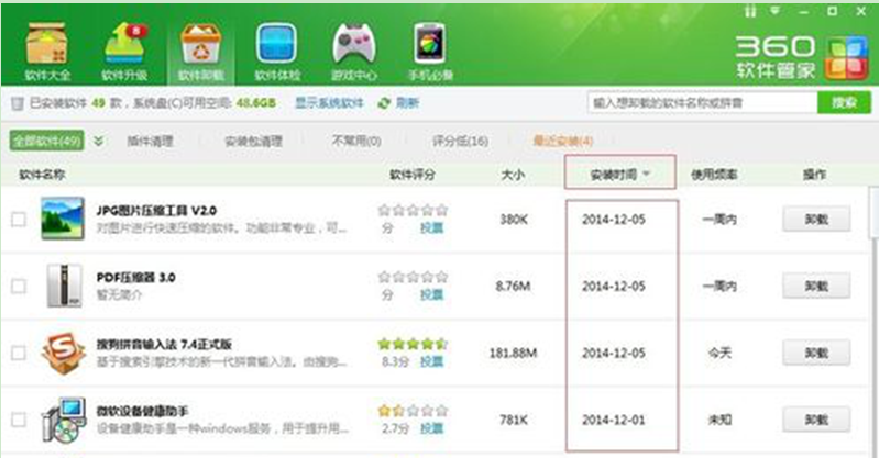 8、点一下“安装时间”,我们就可以看到最近我们安装过什么软件,一般情况下,你找到哪天出现死机这种情况,对应着哪天安装的软件,然后点击卸载掉,即可。